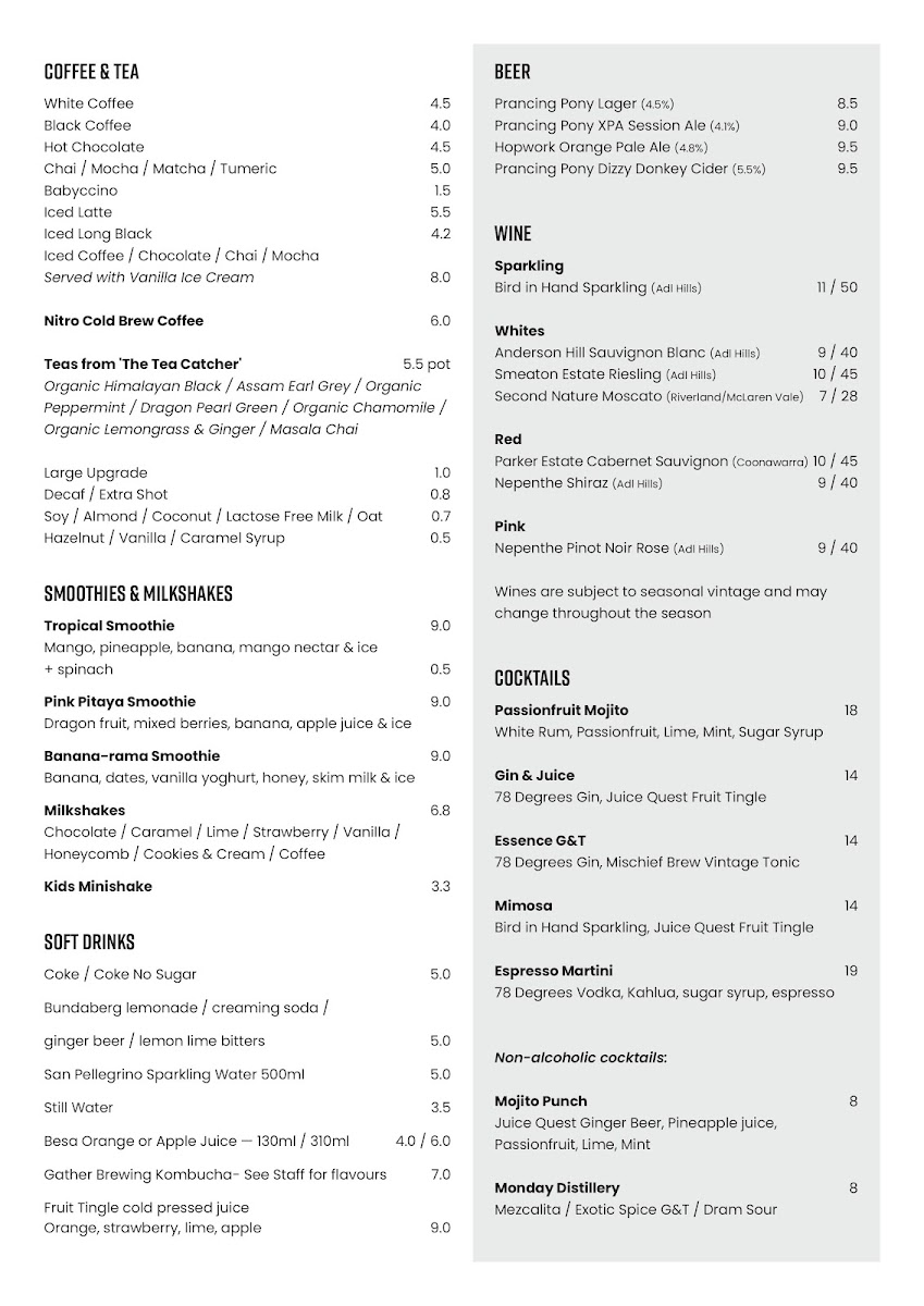 The Essence Cafe Menu